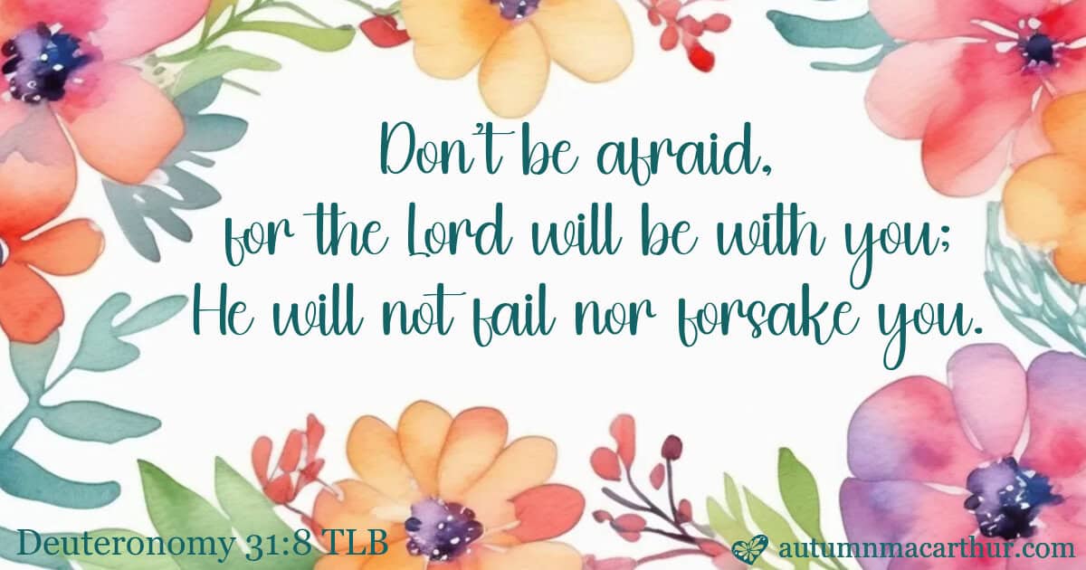 “Don’t be afraid, for the Lord will go before you and will be with you; he will not fail nor forsake you.” Deuteronomy 31:8 TLB