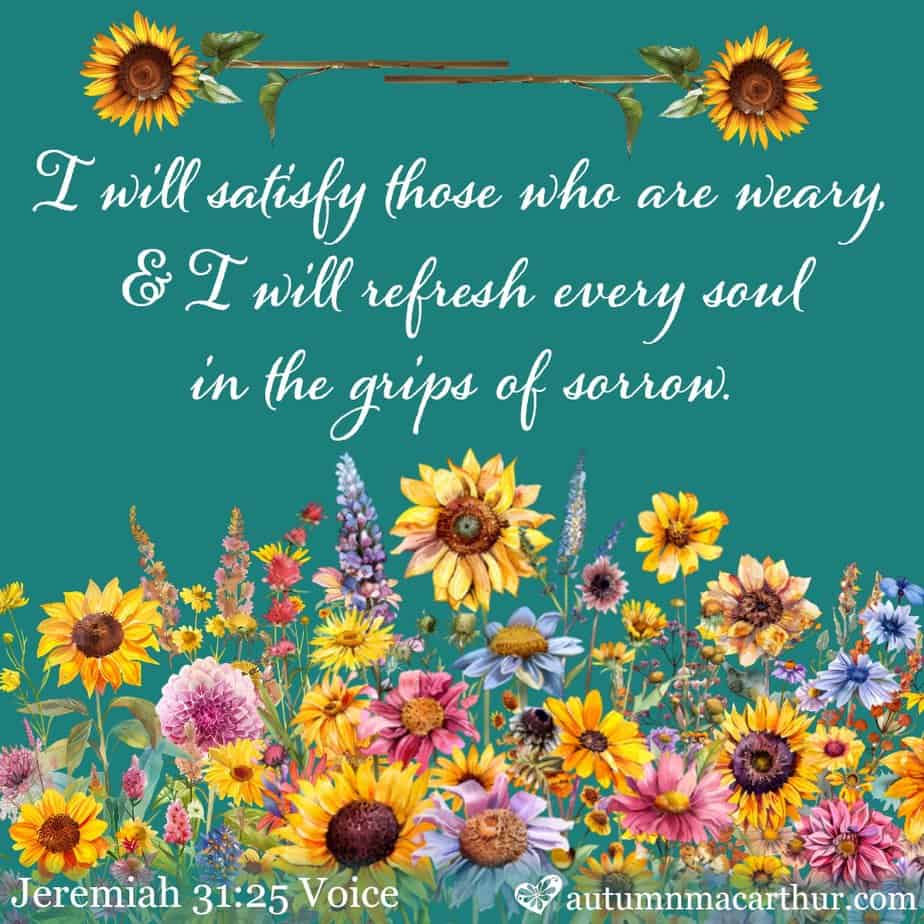 Image of wildflowers, with Bible verse I will satisfy those who are weary, and I will refresh every soul in the grips of sorrow. Jeremiah 31:25 Voice