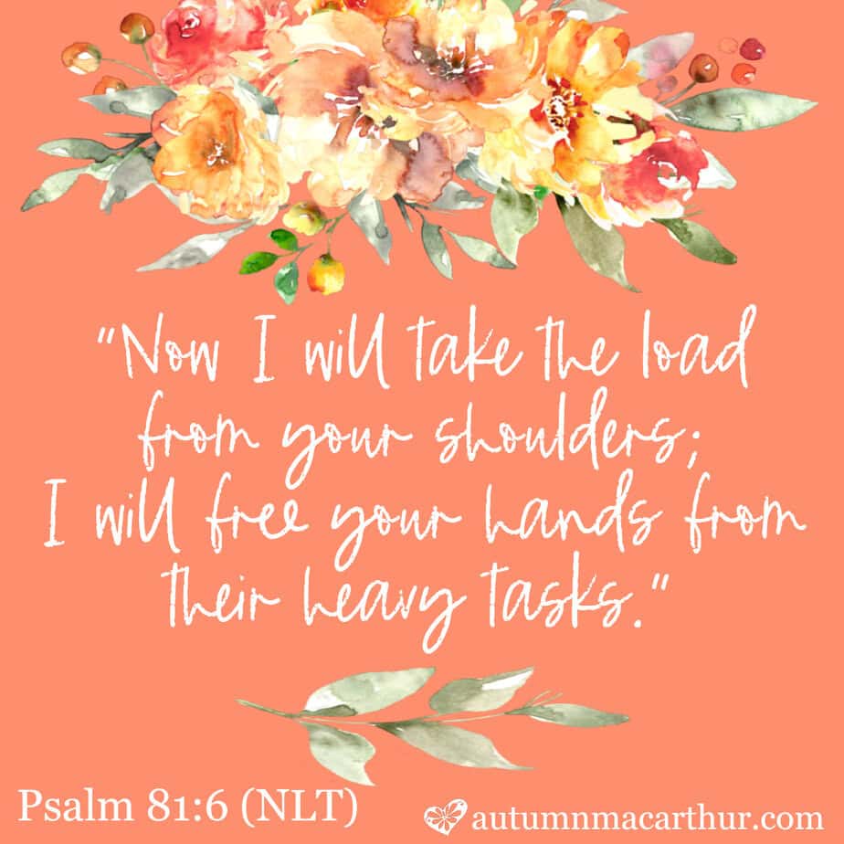 Now I will take the load from your shoulders; I will free your hands from their heavy tasks. Psalm 81:6 NLT