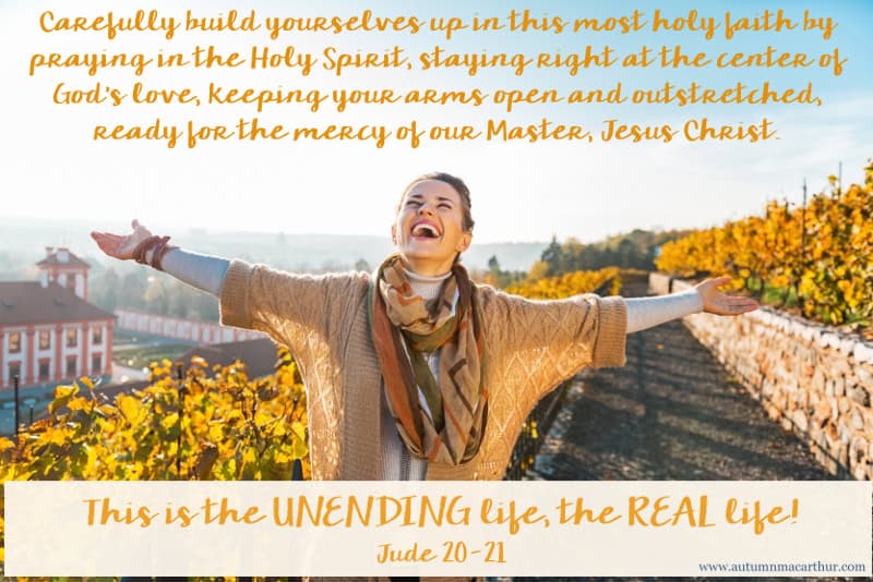 But you, dear friends, carefully build yourselves up in this most holy faith by praying in the Holy Spirit, staying right at the center of God’s love, keeping your arms open and outstretched, ready for the mercy of our Master, Jesus Christ. This is the unending life, the real life!