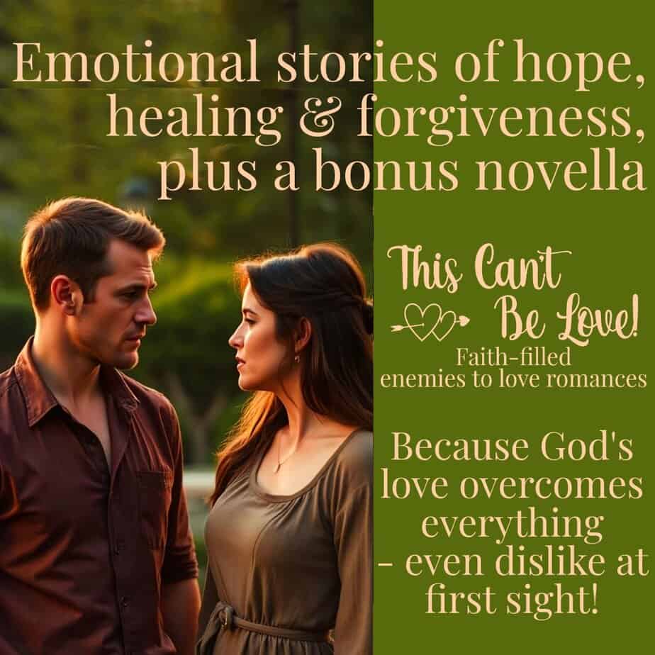 Romance blossoms between initially antagonistic couples in the six clean, faith-filled, enemies-to-love previously published romances in the This Can’t Be Love! set! Okay, maybe “enemies” is overstating things, but these couples definitely do not get on well at the start of the story!