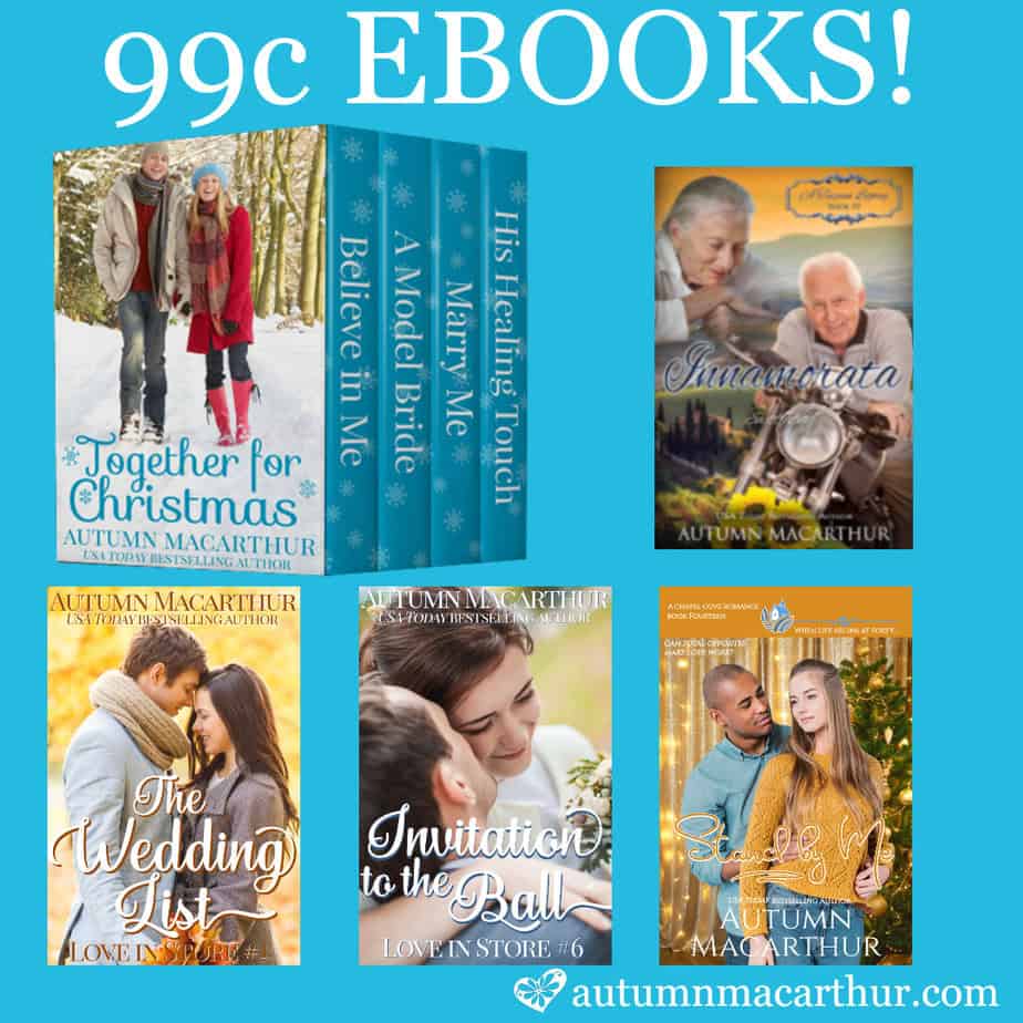 - Together for Christmas – a set of four heartwarming romances focused on the real meaning of Christmas, one from each of my four main series. Available on Amazon.